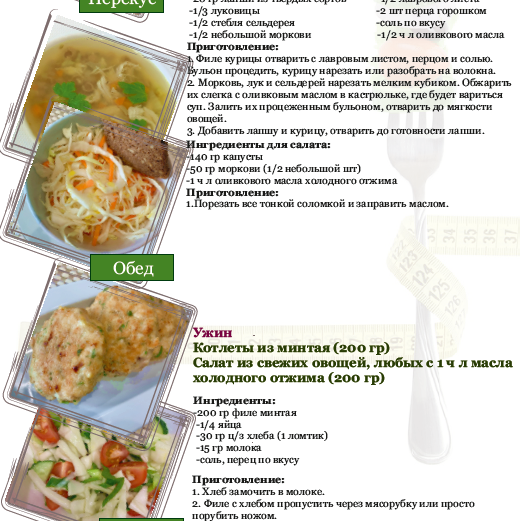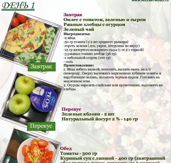 Рацион составлен с учетом среднесуточного потребления от 1300 ккал до 1900 ккал (4 варианта), соотношение БЖУ,% - 30/30/40 оптимально для похудения без вреда здоровью.