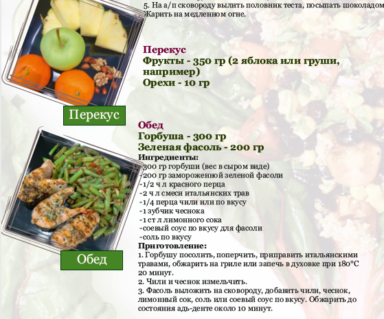 Для оптимального разгона обмена веществ, приемы пищи разделены на 4 раза, в процентном соотношении по калориям, от суточной нормы потребления.25% приходится на завтраки, 35% - обед, и по 20% на легкий перекус и ужин.